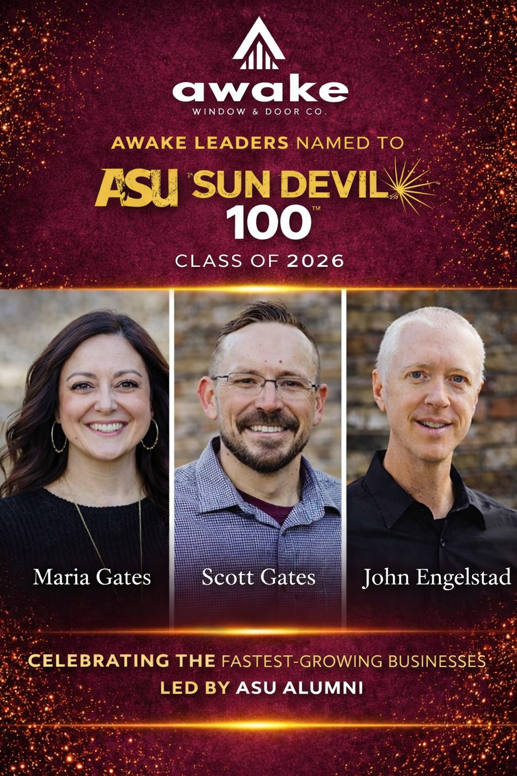Awake Window & Door Co. is proud to announce that three members of its leadership team, Scott Gates, CEO; Maria Gates, CPO; and John Engelstad, COO, have been named honorees in the prestigious Arizona State University Sun Devil 100, Class of 2026, presented by the ASU Alumni Association.