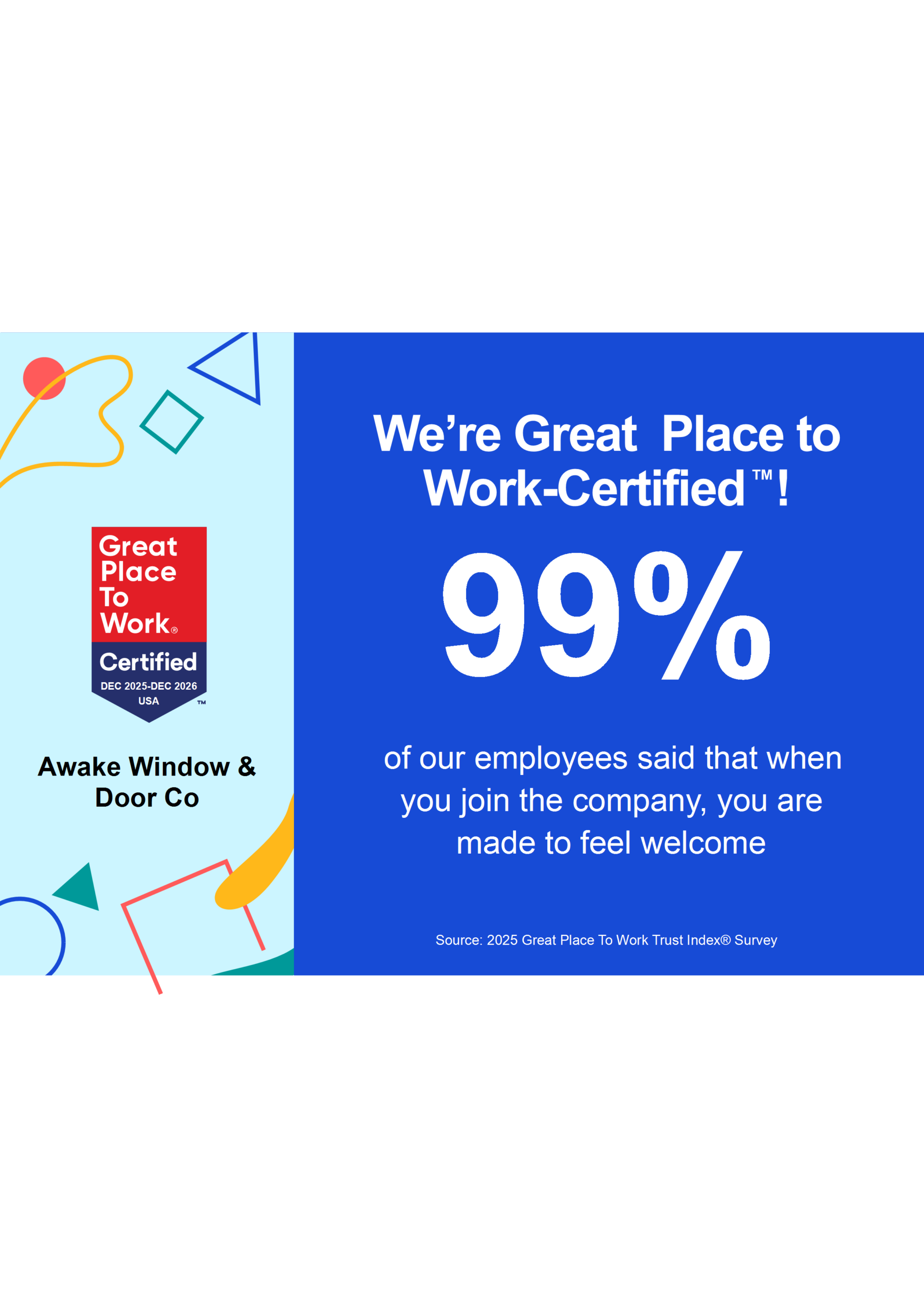 The response is really something to be proud of: 96% of employees at Awake Window & Door Co. say it is a great place to work!